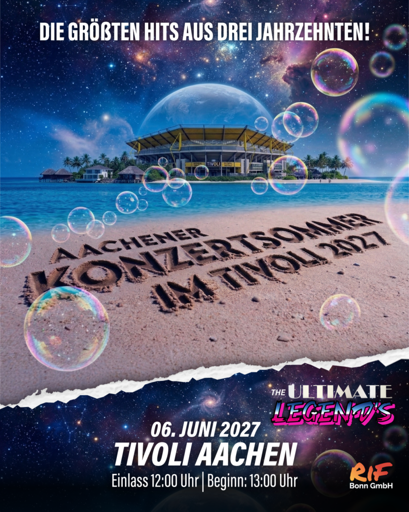 Am 06.06.2027 heißt es im TIVOLI Aachen: Bühne frei für The Ultimate Legend’s – eine unvergessliche Nacht voller Kult-Hits und ikonischer Künstler. Im Rahmen des Aachener Konzertsommers holen wir auf vielfachen Kundenwunsch die größten Songs und Stars aus gleich drei Jahrzehnten auf die Bühne und erweitern das Konzept zu einer einmaligen musikalischen Zeitreise durch die 80er, 90er und 2000er. Dich erwartet ein Abend voller Nostalgie, Gänsehaut-Momente und Mitsing-Garantie – von den größten Pop- und Rock-Hymnen bis hin zu den legendärsten Dance-Classics.